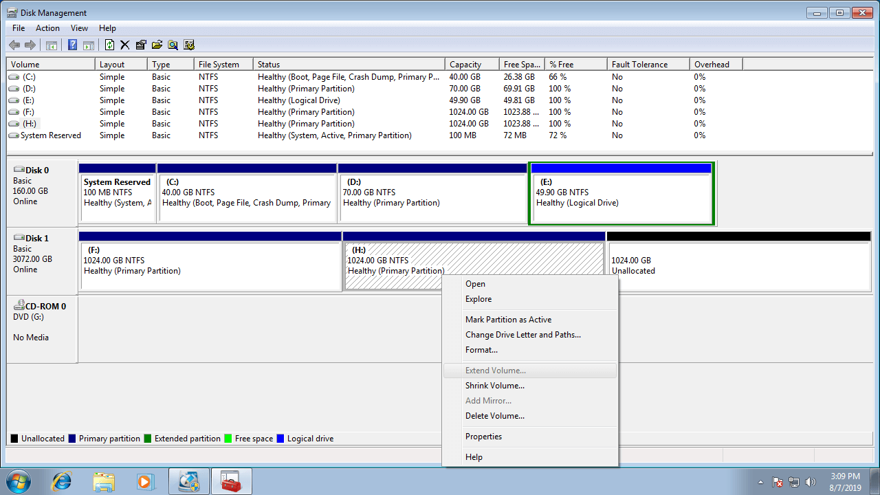 - Extend Volume greyed out for E drive, because Unallocated space is on the left side of it.