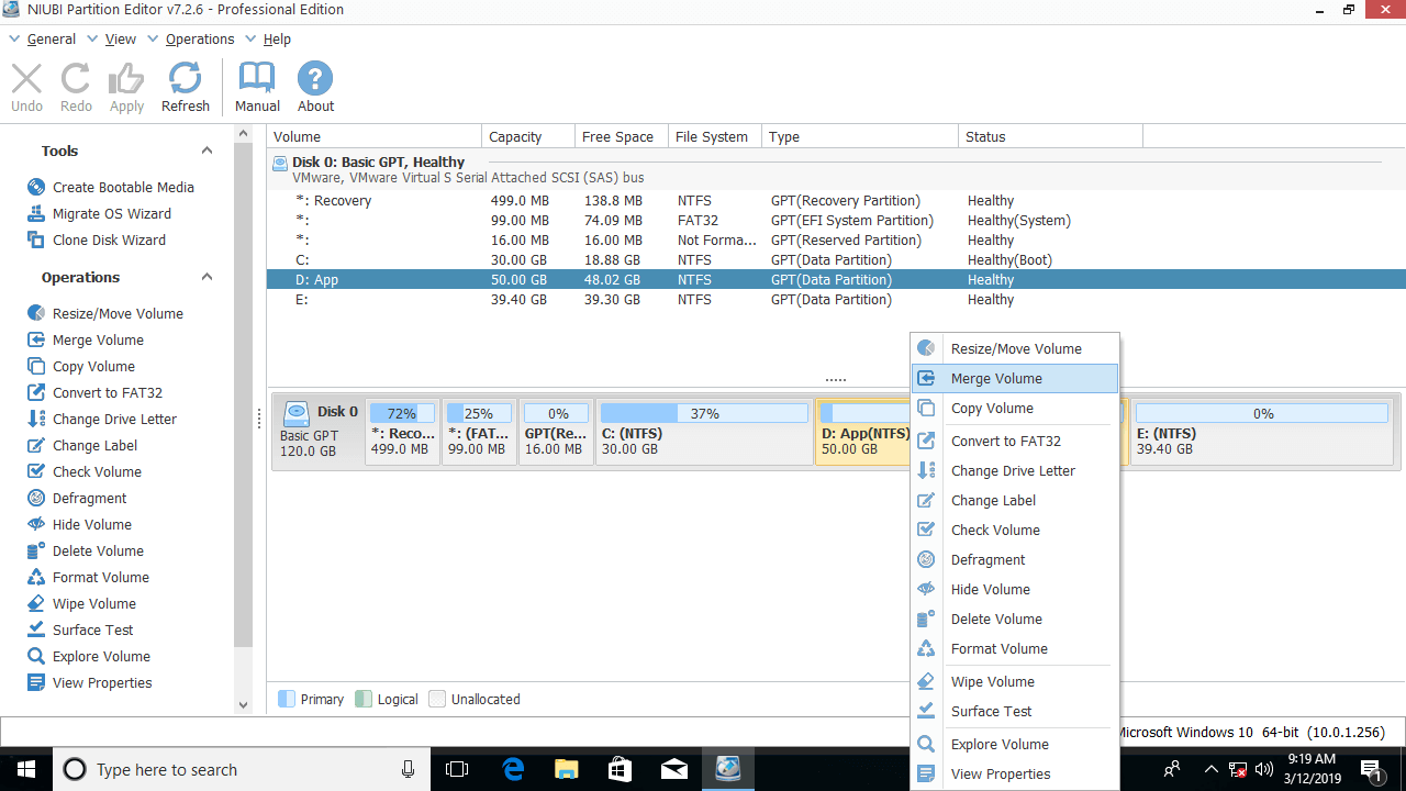 - Download and install NIUBI Partition Editor, right click either C or D drive and select Merge Volume.