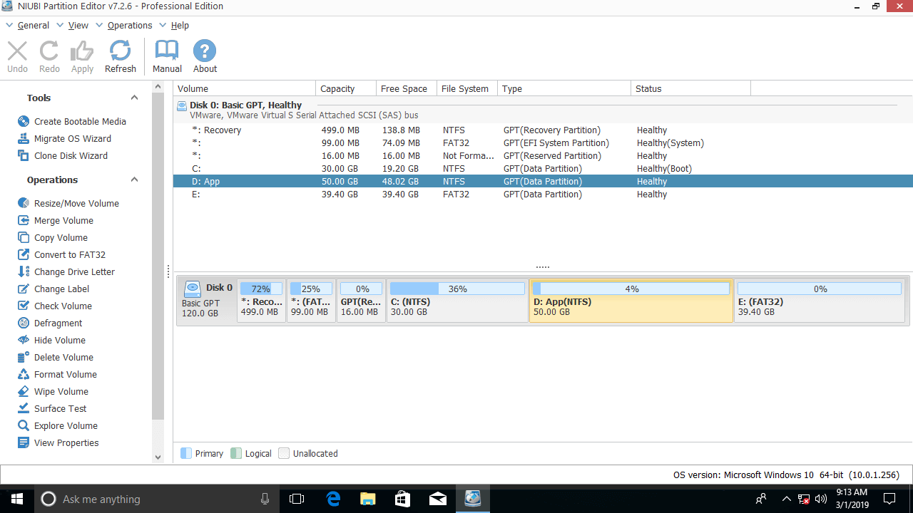 Download NIUBI Partition Editor, you'll see the main window with disk partition structure and other information on the right, available operations to selected disk or partition are listed on the left and by right clicking.