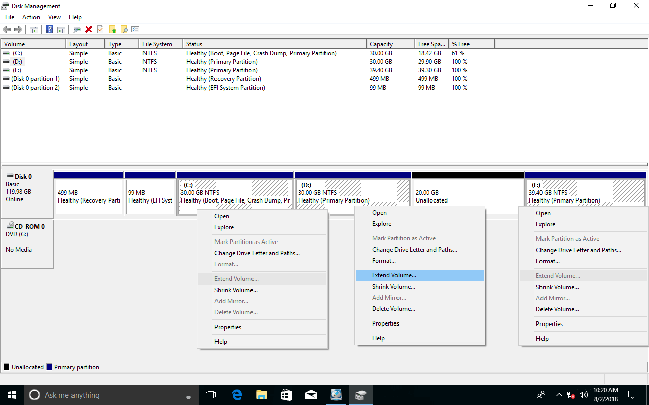 The partitions to delete and extend must be the same Primary or Logical drive. Otherwise, Extend Volume still greyed out after deleting.