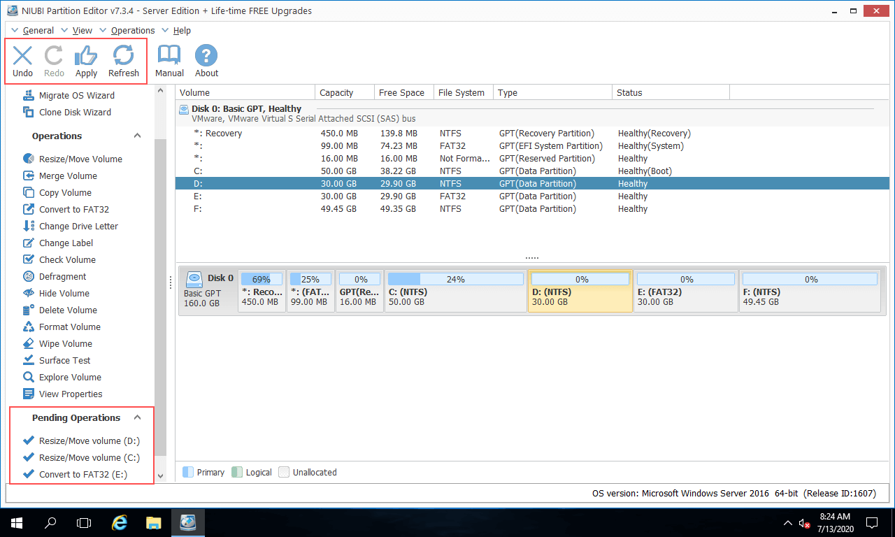 It is common that you did something wrong, or change your mind after did an operation. To avoid mistake, NIUBI Partition Editor is designed to work in its own virtual mode, all operations you do will be listed as pending for preview on bottom left of the main window. If you find any incorrect operations, simply click Undo to cancel. If you canceled some pending operations by mistake, simply click Redo, these operations will come back immediately. Real disk partition won't be modified until you click Apply to confirm.