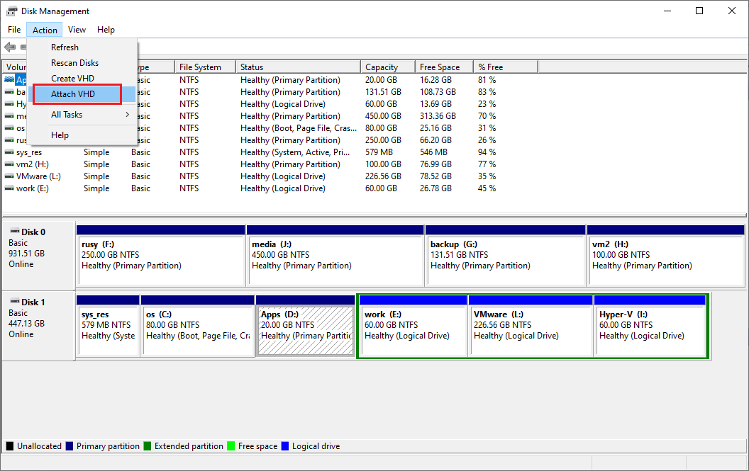 Step 2: Click Action menu > Attach VHD