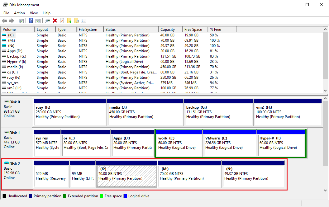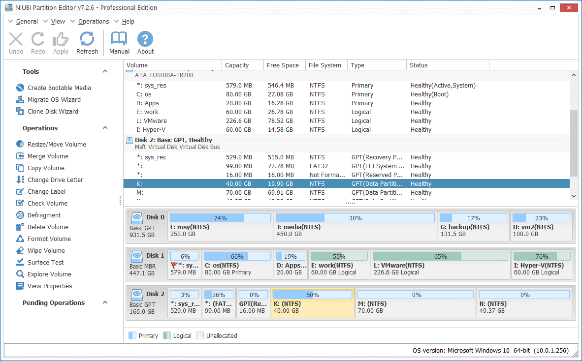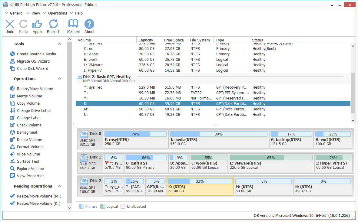 Step 4: Download and install NIUBI Partition Editor to the physical server or personal computer. The same with Disk Management, you'll see all physical and virtual disk partitions in NIUBI Partition Editor. In virtual Disk 2, drive K is the system partition in VHD/VHDX.