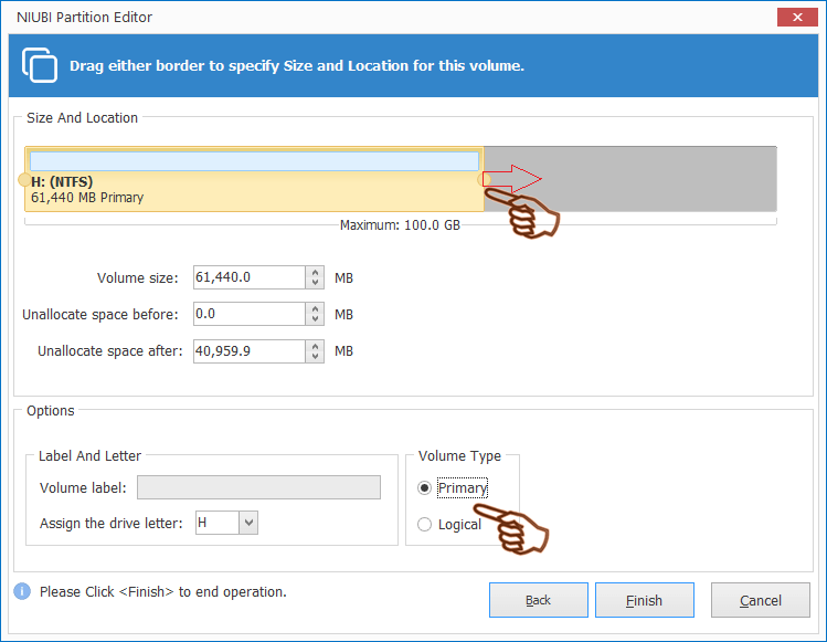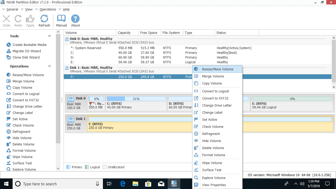 When there's contiguous unallocated space, it is very easy to move partition in Windows 10/8/7 computer, just drag and drop on the disk map and only 1 step is needed. If you use hardware RAID arrays such as RAID 0/1/5/10, do not break RAID array, follow the same step below.