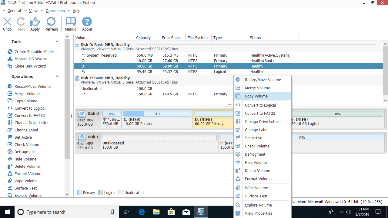Step 2: Right click the partition that you want to move (here is D:) and select "Copy Volume".