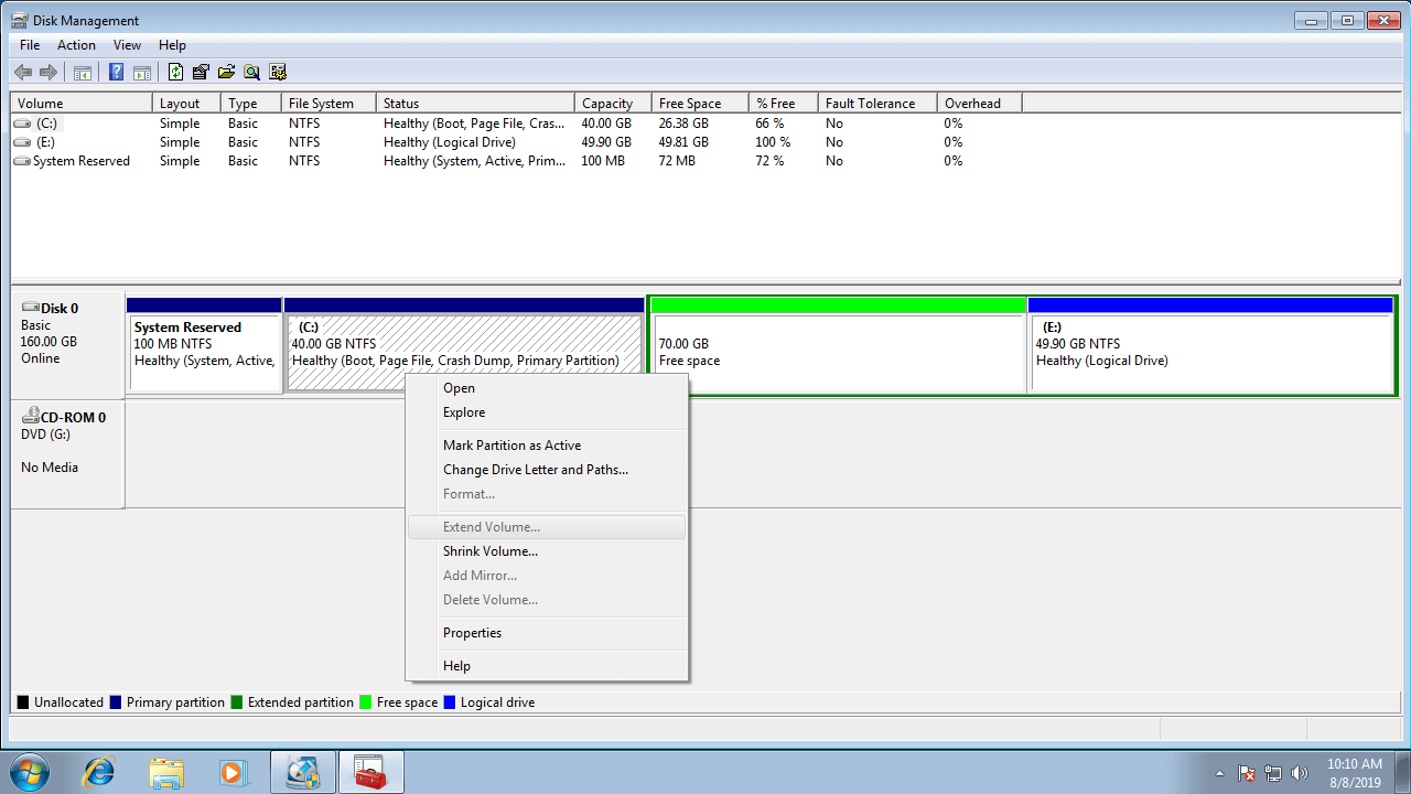 Drive C is non-adjacent and E is on the right of the Unallocated space, therefore, Extend Volume function doesn't work.