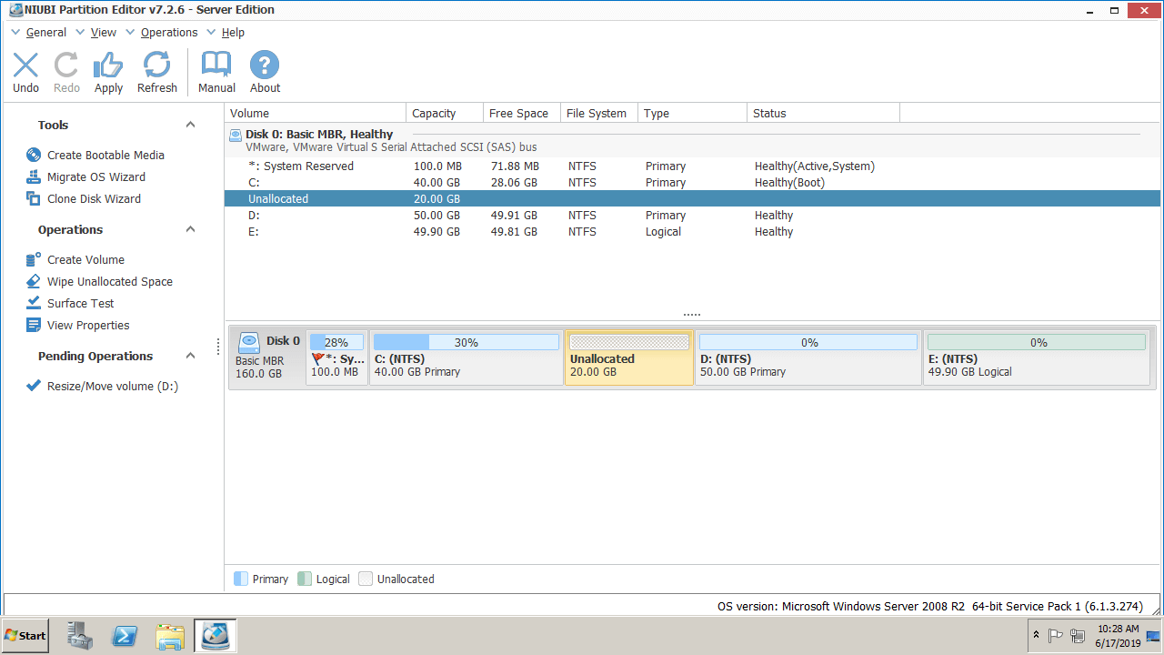 How to extend C: drive in Windows Server 2008 R2 with NIUBI Partition Editor: