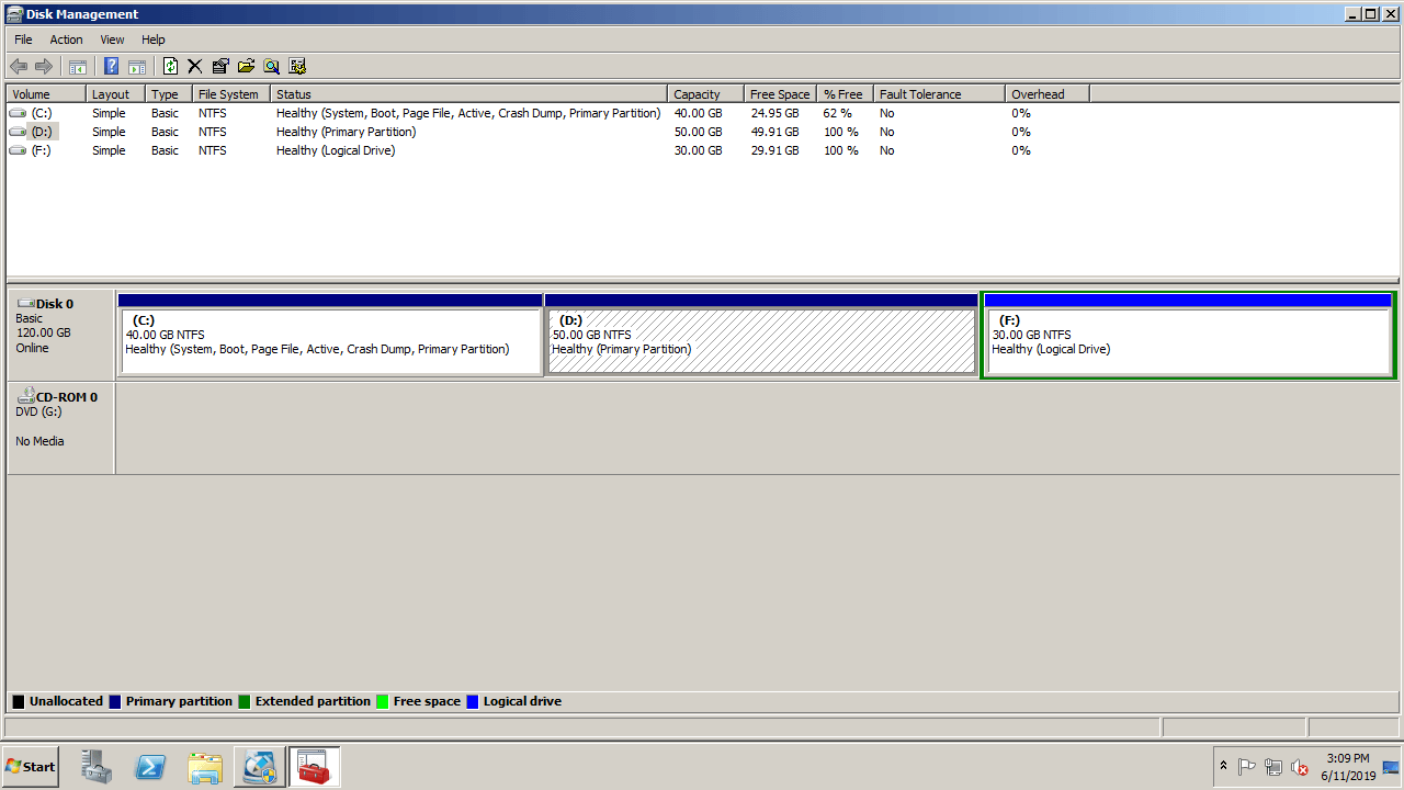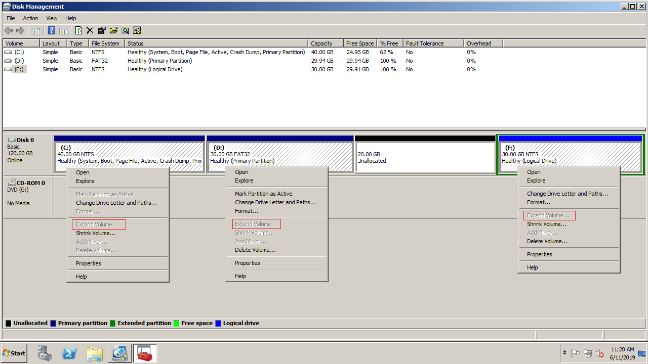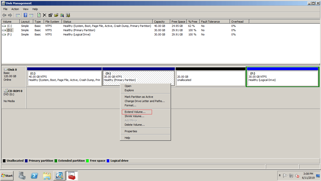 Steps to extend volume in Windows Server 2008 R2 without software: