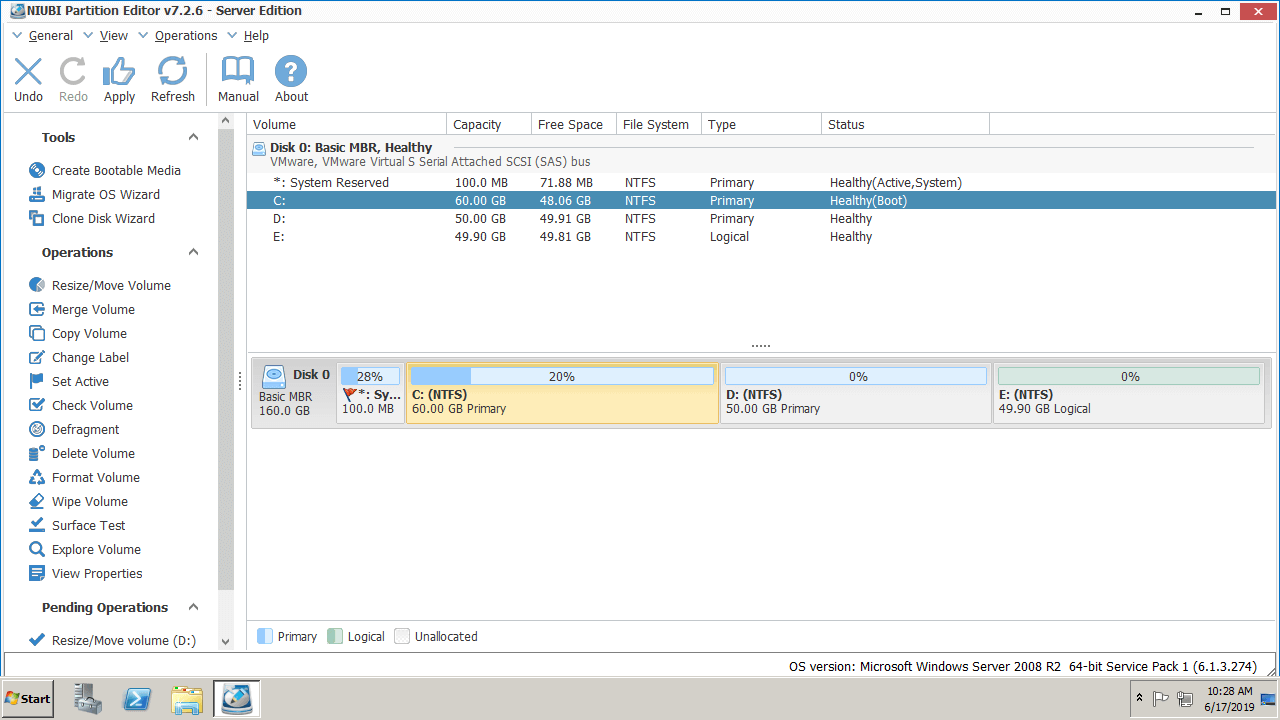 Download and install NIUBI Partition Editor to the virtual server, then you'll see all virtual disk partitions with structure and other information on the right, available operations to selected disk or partition are listed on the left or by right clicking.