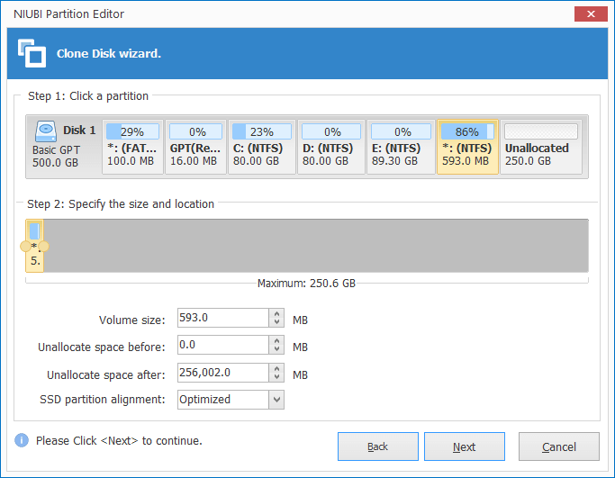 - Edit the size and location of partitions on destination disk. Start from the last one. Drag either border of a partition, then you can shrink or extend this partition. Drag the middle of this partition, then you can move it with adjacent Unallocated space.