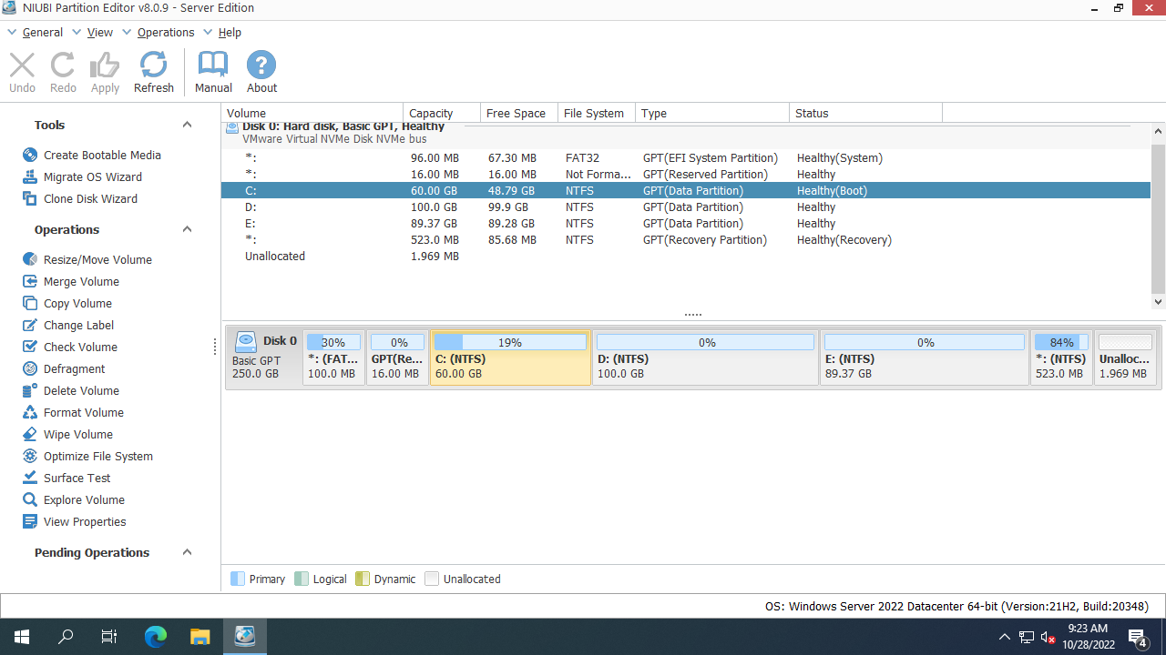 Besides shrinking, moving and extending partitions in Windows Server 2022/2025 and previous Server 2019/2016/2012/2008/2003, NIUBI Partition Editor helps you do many other disk partition management operations.